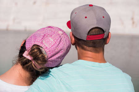 back view of friends in stylish clothes standing on river bank