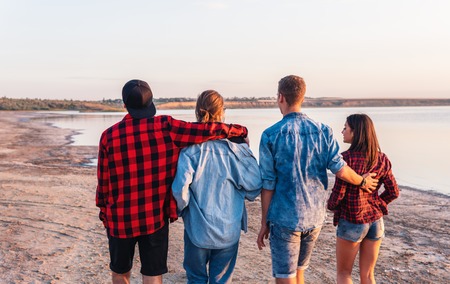 Two love couples standing by lake in park back view. Romantic rest of four young people in nature, two girls and two guys looking at calm water. Contemplation, harmony, relationship concept