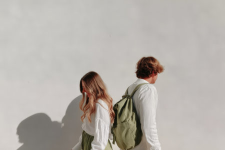Couple facing away, clad in light fashion, a minimalistic tableau against a clean white canvas