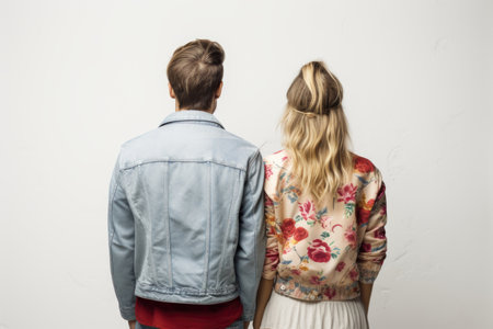 Fashion-forward couple, backs to the camera, flaunting contemporary style against a minimalist white setting