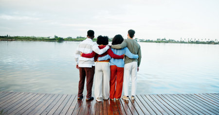 Holiday, nature and friends with hug at lake for trip support, scenery and vacation sightseeing. Back, group and people bonding together outdoor for winter adventure, destination and travel journey
