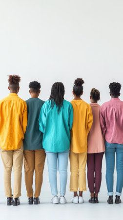Five individuals stand in a minimalist setting, facing away. They wear colorful clothing, reflecting their unique styles. The bright, empty background enhances their presence and friendship.