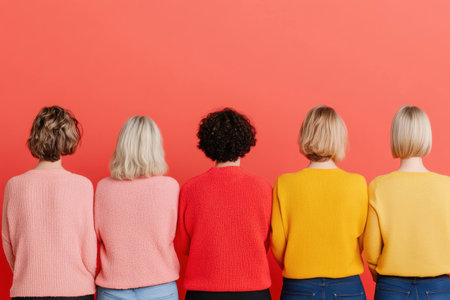 Group of women in colorful sweaters standing against a red background, showcasing different hairstyles and emotions in a vibrant, contemporary style