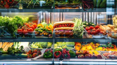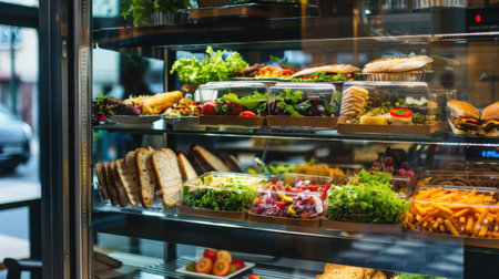 Showcase with cakes, sandwiches and pastries in the store. Small business, food concept. Lots of pastries in pastry shop