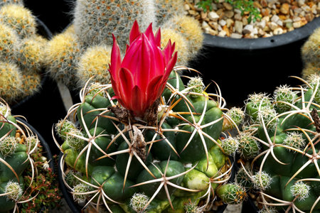 Gymnocalycium sp. - close-up of a blooming cactus with long spines in a botanical collection
