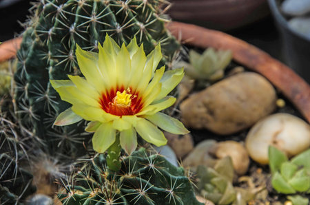 Cactuses with yellow flowers in the botanical garden, Thailand.