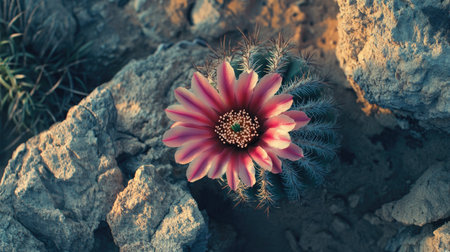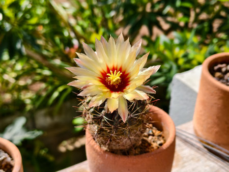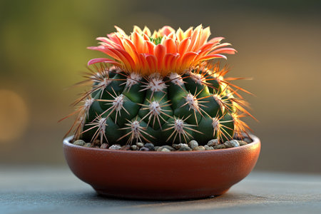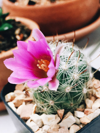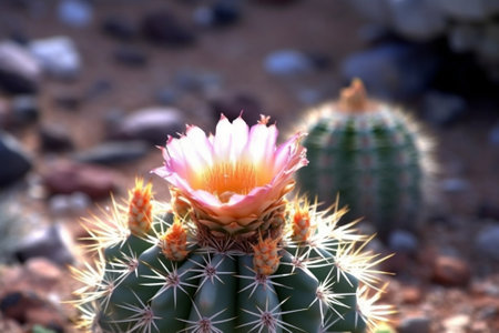 Blooming Mammillaria spinosissima cactus, spiny pincushion with colorful flowers, placed on a minimal background with ample space for design