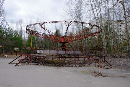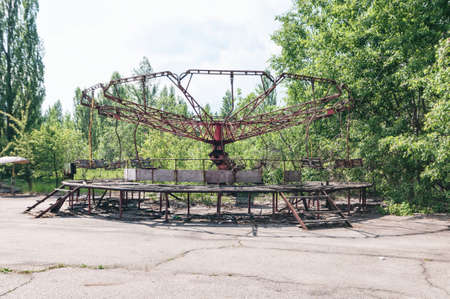 Old broken rusty metal radioactive children's electric wheel abandoned, the park of culture and recreation in the city of Pripyat, the Chernobyl disaster, Ukraine.