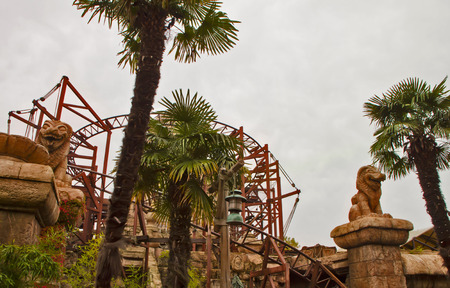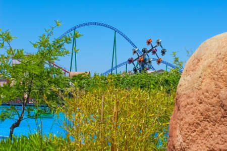 Belek, Antalya, Turkey - May 15, 2021: The Land of Legends theme park in Belek. Hyper coaster and Sky Fighters attraction