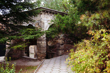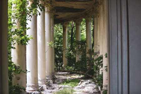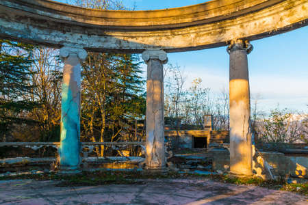 Colonnade of the abandoned building of the former restaurant on the top of Mount Akhun in sunny autumn day, Sochi, Russia