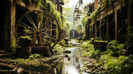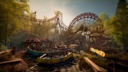 an abandoned amusement park with derelict rides and faded signage, created with generative ai