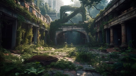 abandoned city captured with a misty atmosphere, using a nikon d750 and a soviet lens. this photo showcases a grid-based, fictional landscape with a touch of carnivalcore. it evokes a sense of environmental activism, highlighting the beauty in decay and the consequences of neglect. ai generated