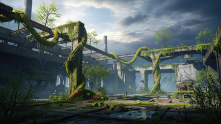 Abandoned amusement park with attractions overgrown with trees, AI generative eerie, derelict urgan landscape