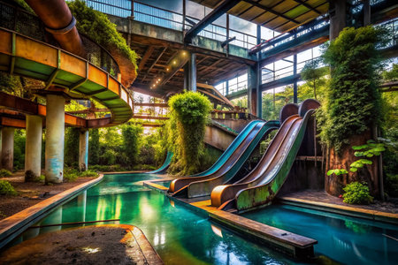 Step into a forgotten realm where laughter and splashes once echoed through the halls of this indoor waterpark. Captured in the crisp light of urban exploration photography, the decaying grandeur of this abandoned aquatic complex is breathtaking. Rust-coated pipes wind their way through the silent, cavernous space, a testament to the passage of time. The once vibrant water slides, now draped in shadows and dust, whisper tales of youthful exuberance and carefree fun. Leafy vines cling to the weathered surfaces, reclaiming the space from the human world. This evocative scene, bathed in the soft, diffused glow of natural light filtering through broken windows, embodies the melancholic beauty of a lost place. The decaying structures, once a source of joy and excitement, are now a fascinating study in urban decay. This photograph serves as a poignant reminder of the ephemeral nature of human-made environments and the ever-present power of nature to reclaim what was once ours. The intricate details, from the peeling paint on the walls to the rusted metal, are meticulously captured, revealing a world of silent stories waiting to be discovered. The atmosphere is dark and atmospheric, yet the light that penetrates the space creates a captivating contrast, hinting at the memories and experiences that once filled these halls. This urban exploration masterpiece offers a glimpse into the fascinating world of abandoned spaces and the beauty of decay.
