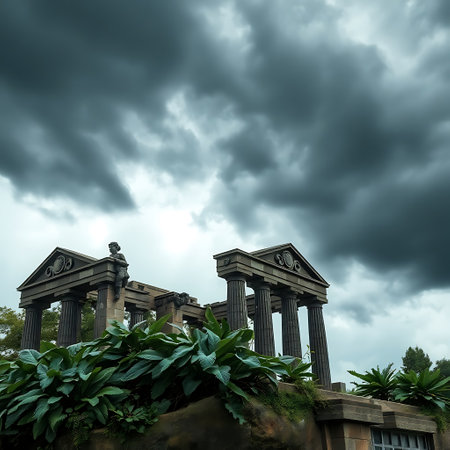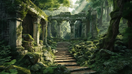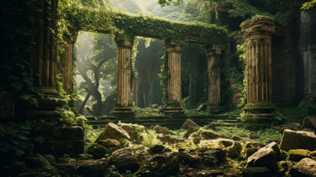 Temple ruins overtaken by nature ivy-covered columns and fallen stones