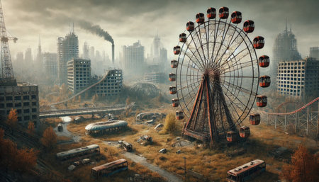 Eerie abandoned amusement park with ferris wheel in post apocalyptic cityscape.