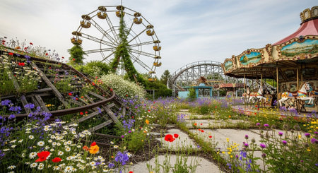 Abandoned Theme Park with Overgrown Ferris Wheels