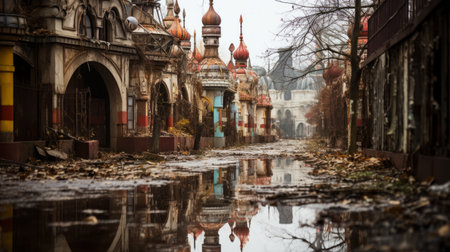 foggy street with decayed buildings and a ferris wheel, capturing the kitsch and camp charm of a french landscape. this national geographic photo showcases the beauty of decay in 8k resolution, with rusty debris and a soggy atmosphere adding to the captivating scene. ai generated
