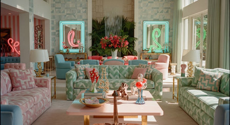 A stylish mid-century modern living room featuring bold colors, unique furniture shapes, and artistic decor elements