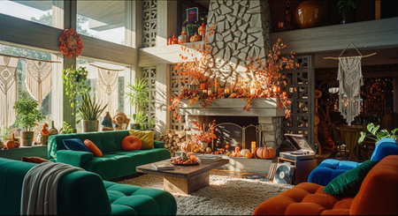 A cozy living room decorated for autumn, featuring colorful sofas, a stone fireplace adorned with pumpkins and fall foliage, large windows letting in natural light, and macrame wall hangings