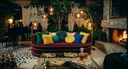 A cozy and vibrant living room filled with eclectic furniture, colorful art, and lush green plants, creating a warm and inviting atmosphere.