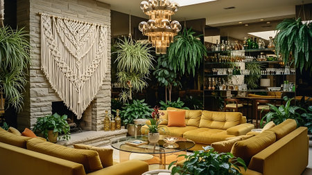 Inspiring office interior design Bohemian style Co-working featuring Hanging plants architecture. Generative AI AIG 31.