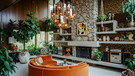 A cozy living room featuring a stone fireplace, vibrant floral wallpaper, and lush indoor plants, with retro furniture and colorful rugs