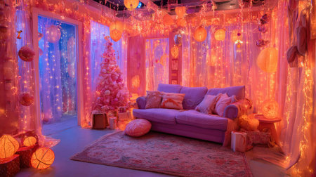A cozy living room featuring soft pink decor, illuminated by warm string lights. This inviting space is perfect for festive gatherings or quiet relaxation.