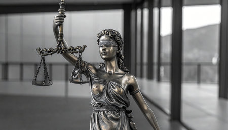 A grayscale close-up of a Lady Justice statue holding scales and wearing a blindfold, set against a blurred modern interior.