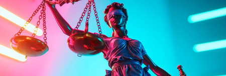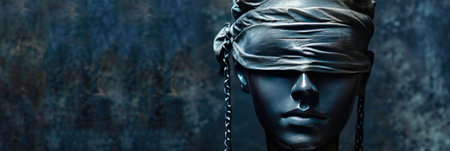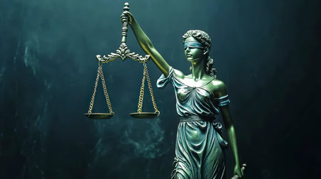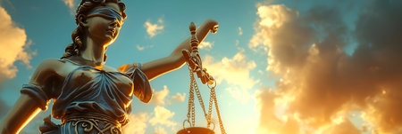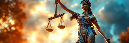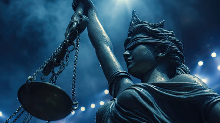 A close-up view depicts a statue of Lady Justice, blindfolded and holding scales high. The sculpture has a classical style, and the composition is dramatically lit. The scene suggests a symbolic representation of legal principles, possibly suitable for editorial or commercial applications.
