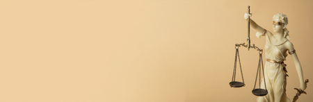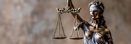A close-up, horizontal shot of the bronze statue of Lady Justice, blindfolded and holding scales and a sword, set against a neutral, softly lit background.