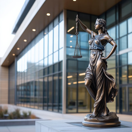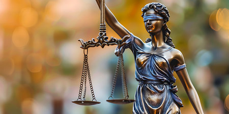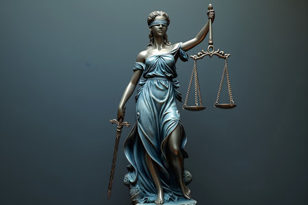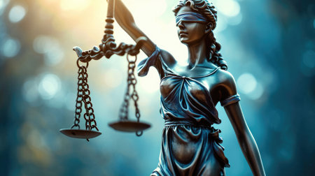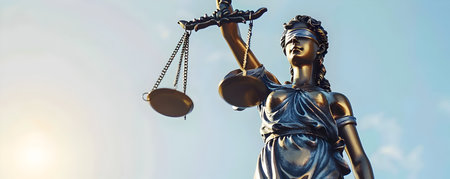 The iconic statue of Lady Justice, with scales and sword, set against a peaceful blue sky, symbolizes the ideals of the legal system