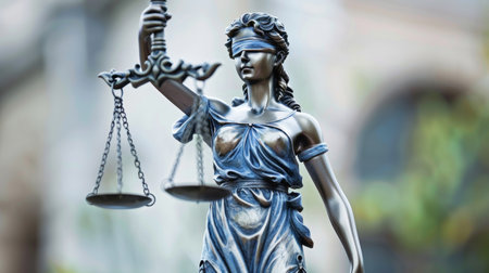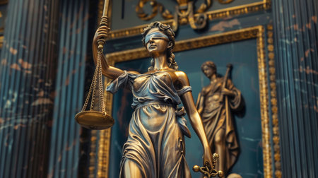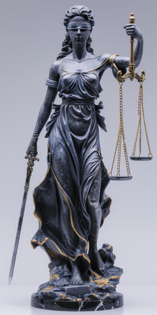 A statue of Lady Justice, a female figure blindfolded and holding a sword and a scale, symbolizing impartiality and fairness in the judicial system. The sword represents the power of justice, while the scale signifies the balance and weighing of evidence in court proceedings.