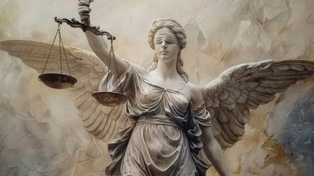 Symbolic scales of justice Themis: legal balance, fairness, and morality in the courtroom, a representation of virtue, ethics, and impartiality in the legal system.