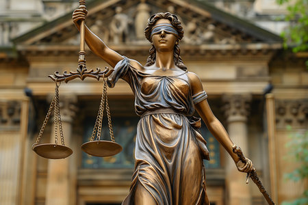 A detailed bronze Lady Justice statue is depicted blindfolded, holding scales. Symbolizing fairness and law, this image conveys justice and impartiality in an outdoor environment.