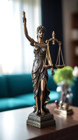 A crafted bronze figure stands gracefully, clutching scales that symbolize equity and objectivity, set against a soft glow of amber lights in a shadowed ambiance.