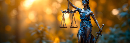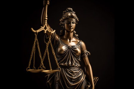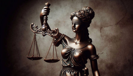 A close-up view presents a bronze-colored statue of Lady Justice holding scales. The figure is draped in classical robes. The scales, delicately balanced, are held aloft. The scene is illuminated by soft lighting, highlighting textures and form, suitable for various legal and editorial applications.