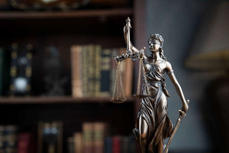 Law and justice concept. Themis sculpture in lawyers office. Bookshelf with legal books in background.