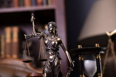Law theme. Judge chamber. Themis statue on brown shining desk. Collection of legal books in the bookshelf.