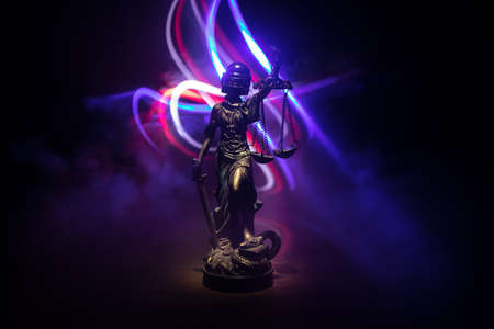 Law concept. Miniature colorful artwork decoration with fog and backlight. The Statue of Justice - lady justice or Iustitia / Justitia the Roman goddess of Justice. Selective focus
