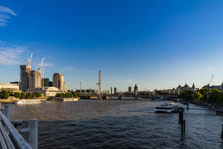 Thames River Embankment, London | UK - 2021.06.26: The view of the CIty Business District from the thames river on beautiful sunset evening