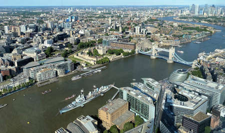 Aerial view of London city skyline at sunset with Tower Bridge, UK