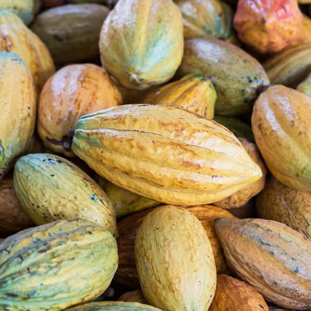 A big bunch of colorful cocoa pods. Criollo, Forastero, Trinitario, different types of cocoa beans just harvested from the tree, Hundreds of exotic ripened fruits ready for making dark chocolate