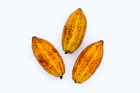 Fresh cacao pods isolated on a white background.