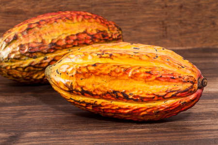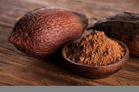 Cocoa fruits on wooden background.