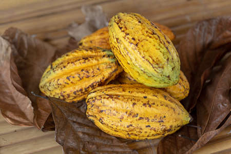 Cacao fruits (Theobroma cacao, cocoa, coklat). Its seeds, cocoa beans, are used to make chocolate liquor, cocoa solids, cocoa butter and chocolate. Cacao (Theobroma cacao) belongs to genus Theobroma.