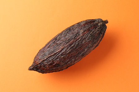 Natural cocoa pod on orange background, top view