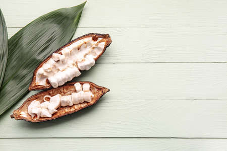 Split fermented cocoa pod with shelled cacao beans atop light gray backdrop, top view, copy space