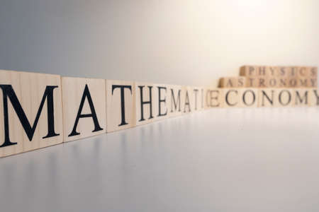 Education concept. Education and math relation. Mathematics, astronomy, economy words with letters from wooden cubes