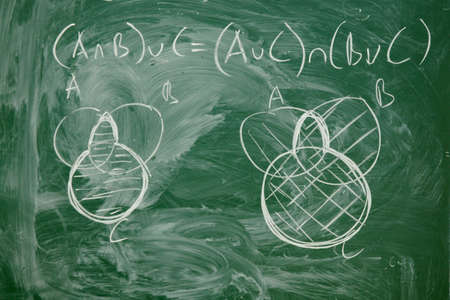 Blackboard inscribed with scientific formulas and calculations in mathematics. Science and education background.